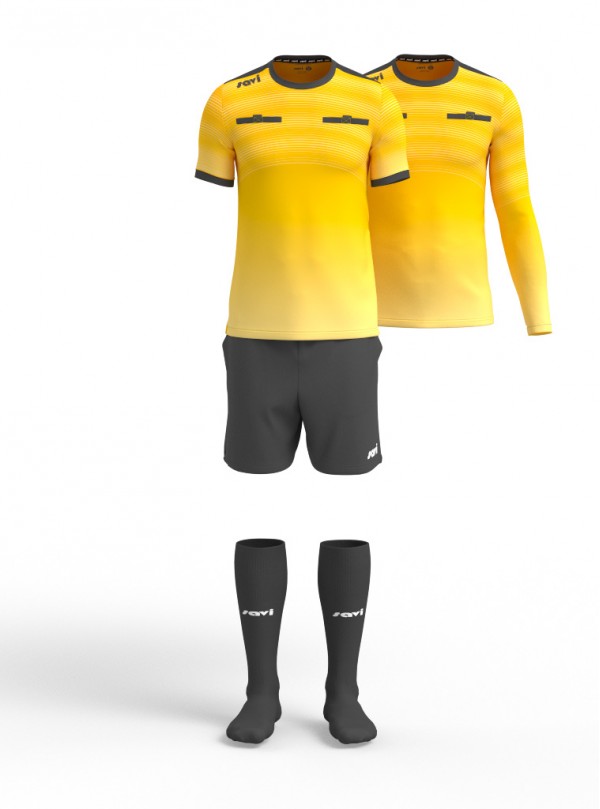 Short sleeves jersey, long sleeves jersey, shorts and referee socks.